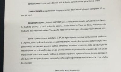 No ofício, o prefeito cita que a população está sendo feita refém de um movimento supostamente orquestrado para pressionar o poder público. O prefeito de...