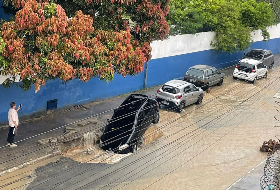 Moradores registraram imagens que mostram o carro praticamente “engolido” pela cratera, evidenciando a dimensão do estrago causado pela chuva intensa que atingiu a região.