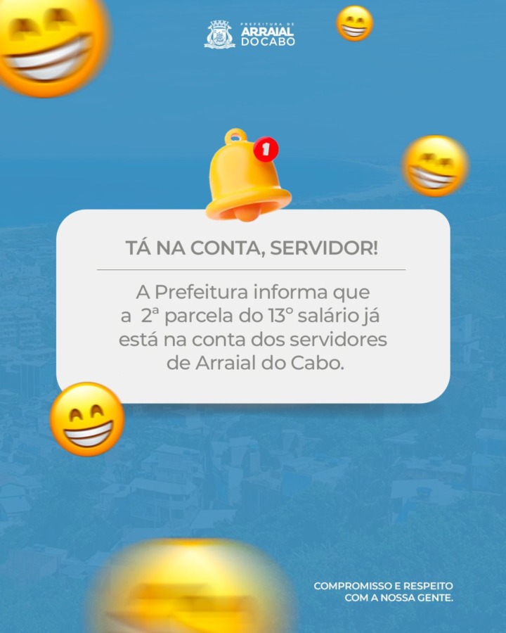 A Prefeitura de Arraial do Cabo informou nesta quarta-feira (18) que a segunda parcela do 13º salário dos servidores públicos municipais já está disponível para saque. O depósito foi realizado conforme o cronograma estabelecido, mesmo diante das dificuldades enfrentadas nos últimos dias, devido à interrupção prolongada no fornecimento de energia elétrica no município.