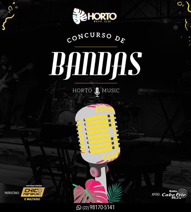 Cabo Frio, na Região dos Lagos, se prepara para o 1º Concurso de Bandas Horto Music. O evento será destinado para músicos que integram bandas de MPB (Música Popular Brasileira), Pop Rock, Reggae, Forró, Sertanejo e Pagode, e terão a oportunidade de mostrar talentos e até mesmo adquirir reconhecido em toda a região.