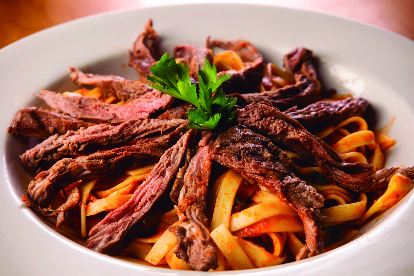 Detroit Steakhouse – Fettucine ao molho marinara com tiras de filé mignon.
