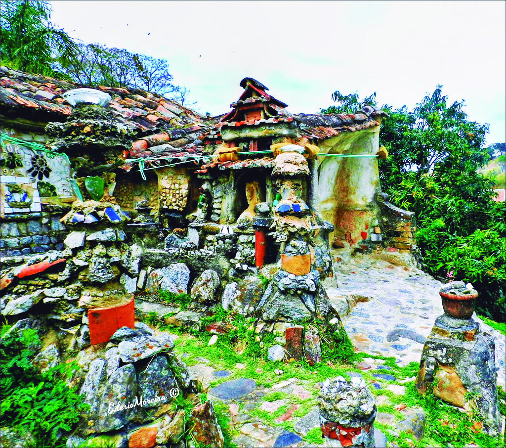 Objetos descartados também foram usados, como lâmpadas queimadas, conchas, correntes, tampas de metal, manilhas e faróis de automóveis. Aos poucos foram formadas flores, folhas, cachos de uvas, colunas e escultura formando mosaicos. A obra pode ser incluída entre os artistas/arquitetos como Ferdinand Cheval, na França; Antoni Gaudi, em Barcelona; Antônio Virzi, no Rio de Janeiro, com arquitetura orgânica e surreal.