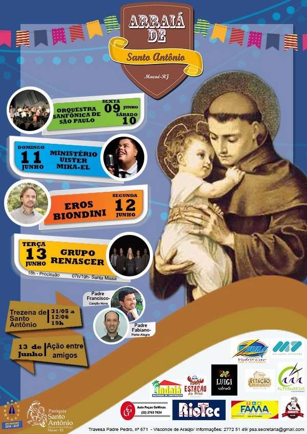 A Paróquia Santo Antonio de Macaé inicia hoje, sexta-feira (09), as comemorações ao santo. Até o próximo dia 13, terça-feira, a programação segue com shows, apresentação de Orquestra Sanfônica de São Paulo, missas e no domingo, dia 11, almoço, ao meio-dia. No cardápio, churrasco. Em seguida, sorteio de brindes.