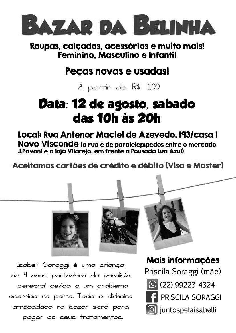 Mais um evento beneficente será realizado em Macaé para ajudar portadora de paralisia cerebral.  O bazar beneficente será no sábado, dia 12 de agosto, das 10h às 20h, na Rua Antenor Maciel de Azevedo, 193, no bairro Visconde (entre o Supermercado J Pavani e Vilarejo). Toda renda arrecadada será revertida ao tratamento de Isabelli Fernandes Soraggi, de 4 anos.