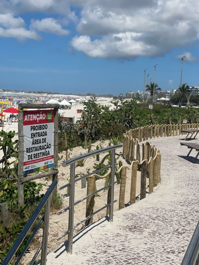 A instalação de cordas de sisal e a reposição de mourões, realizada pela Equipe Verde da Secretaria de Meio Ambiente, Saneamento e Clima, ocorre nesta quinta-feira (26). A iniciativa complementa o plantio de vegetação nativa e orienta banhistas a utilizarem rampas e escadas para acessar a praia, evitando danos à restinga.