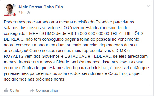 O prefeito de Cabo Frio, Alair Correa (PP), afirmou nesta quarta-feira (15) através de seu blog e de sua página nas redes sociais que pode pagar os salários dos servidores de maneira parcelada. Cabo Frio seguiria o exemplo do Governo do Estado, que anunciou o pagamento dos servidores da mesma forma. A justificativa é, mais uma vez, a queda na arrecadação da cidade, e os cofres públicos vazios. De acordo com o prefeito, o parcelamento pode ocorrer já nesse mês.