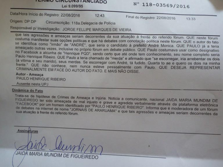 As ameaças foram relatadas no RO (118-03569/2016) e todas as informações no blog Jornais de Araruama. "Estou cansada de sofrer ameaças e abaixar a cabeça. Agora vai ser assim, ameaçou, vamos resolver em frente a um delegado de polícia". Afirma a internauta.