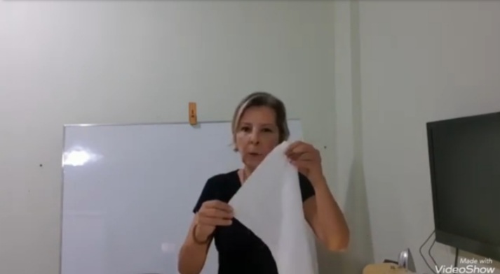 Segundo ela, basta ter um tecido de 40cm x 25cm e um pedaço de meia calça ou de elástico e assistir ao vídeo para aprender a fazer e, em caso de urgência, poder sair de casa com segurança. “Cuide para que a máscara cubra do nariz até embaixo do queixo e que esteja bem fechadinha dos lados. Pronto, a sua máscara está pronta, sem a máquina e, praticamente, a custo zero, e você em segurança”, disse a instrutora.