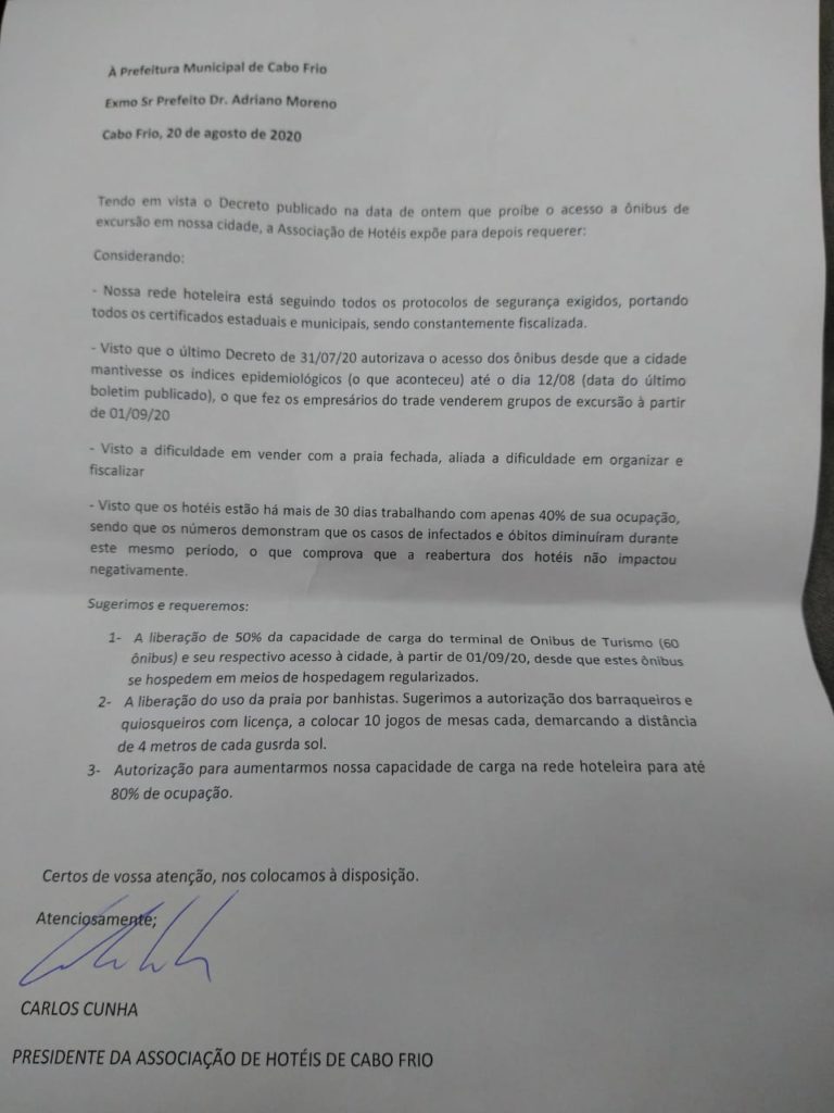 A Associação de Hotéis de Cabo Frio protocolou na Prefeitura de Cabo Frio um documento com as reivindicações da categoria quanto à revogação do decreto que permitia a entrada de ônibus e vans de turismo a partir de 1º de setembro, além de outras demandas como a liberação das praias e aumento na capacidade da rede hoteleira