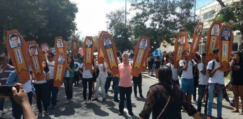 Enquanto isso, no Centro da cidade, centenas de servidores da Educação, da Saúde e estudantes da rede municipal de Cabo Frio, participaram de um cortejo fúnebre de um boneco do prefeito Alair Corrêa, que foi colocado dentro de um caixão de verdade, e saíram pelas principais vias do centro da cidade. No local, além do caixão do prefeito, professores empunhavam tampas de caixões com foto e nome de cada um dos 17 vereadores.