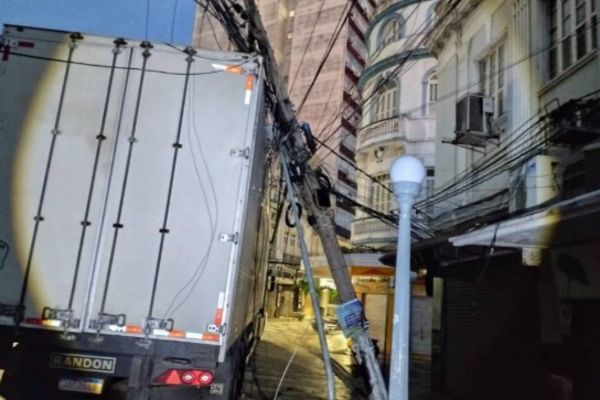Carreta colide em poste e deixa moradores do Centro de Campos sem luz