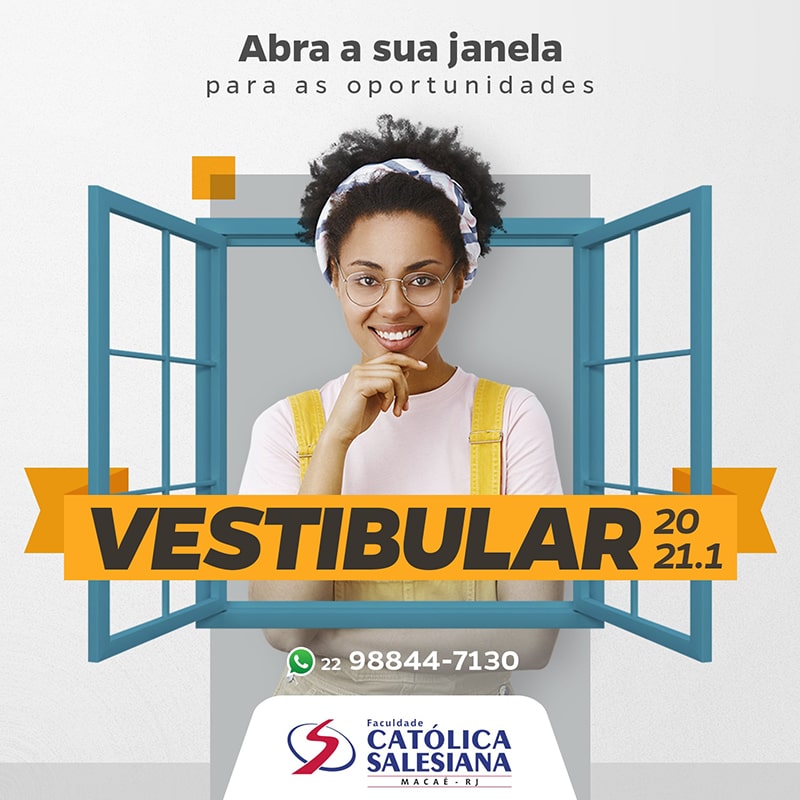 A Faculdade Católica Salesiana está com inscrições abertas para o Vestibular Online Agendado 2021.1. As inscrições são gratuitas e estarão abertas do dia 21 de outubro ao dia 27 de novembro, exclusivamente pelo endereço www.catolicamacae.com.br/vestibular.
