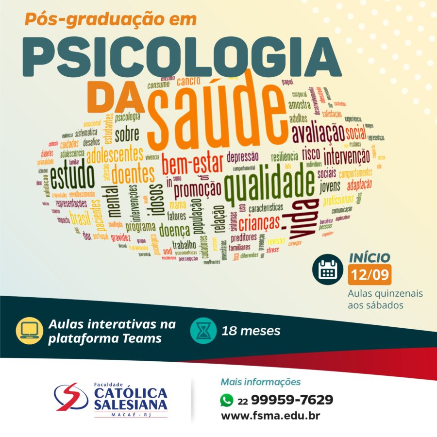 O principal objetivo da pós-graduação é proporcionar a aquisição e o desenvolvimento de competências e habilidades profissionais no âmbito da Psicologia da Saúde, disponibilizando quadro teórico sólido para a identificação das especificidades do trabalho nas organizações e na prestação de serviços de saúde pública e suplementar. Outras informações podem ser solicitadas pelo whatsapp 22 98844-7130.