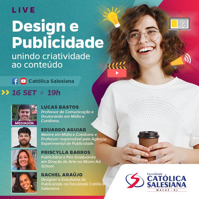 Como alinhar design e publicidade de modo a criar conteúdos criativos e persuasivos será o objetivo da Live “Design e Publicidade: unindo criatividade ao conteúdo”, promovido pela Faculdade Católica Salesiana no dia 16 de setembro, às 19h, pelo canal do YouTube /salesianamacae.