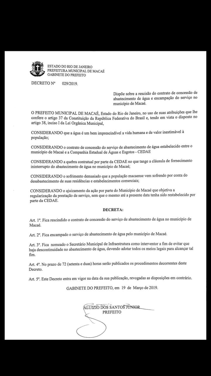 O decreto considera ainda “o sofrimento da população macaense por conta do desabastecimento em suas residências e estabelecimentos comerciais”.Dr Aluizio também decretou que o abastecimento de água em Macaé será, a partir de agora, realizado pelo município, e nomeou o secretário de Infraestrutura, Célio Chapeta, como interventor do processo, a fim de evitar que haja descontinuidade na prestação do serviço aos munícipes. O documento prevê prazo de 72 horas para que sejam publicadas as ações decorrentes da medida assinada pelo prefeito.