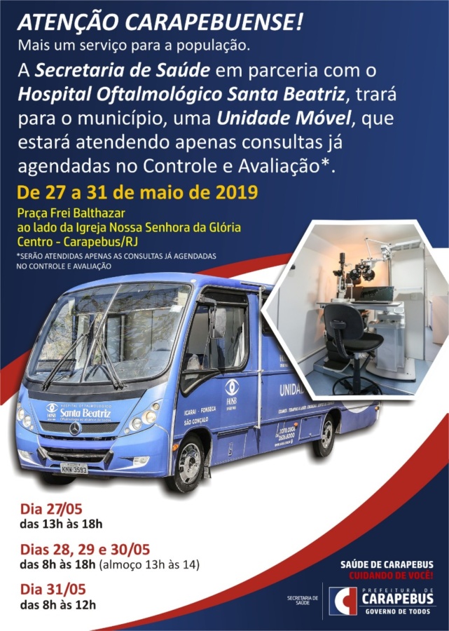 Em parceria com o Hospital Oftalmológico Santa Beatriz, a Secretaria de Saúde de Carapebus realizará a partir do dia 27 (segunda-feira) um “mutirão” para atender as consultas já agendadas. A Unidade Móvel estará na Praça Frei Baltazar do dia 27, segunda-feira, até o dia 31 de maio, sexta-feira, com objetivo de diminuir a demanda de consultas oftalmológicas na cidade.
