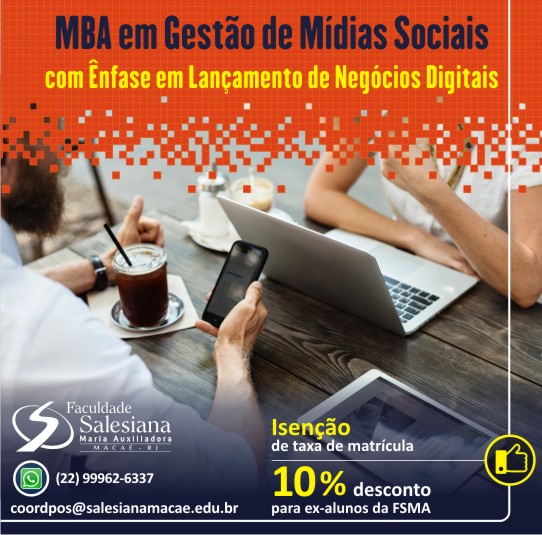 A Faculdade Salesiana Maria Auxiliadora – FSMA – acaba de completar 17 anos de atuação em Macaé, após ter recebido a Nota 4 pelo MEC, atestando a qualidade no ensino. E, além dos cursos de graduação a FSMA ainda dispõem de cursos de pós-graduação, entre eles o MBA em “Gestão de Mídias Sociais com Ênfase em Lançamento de Negócios Digitais”, que está com inscrições abertas para início ainda nesse segundo semestre.
