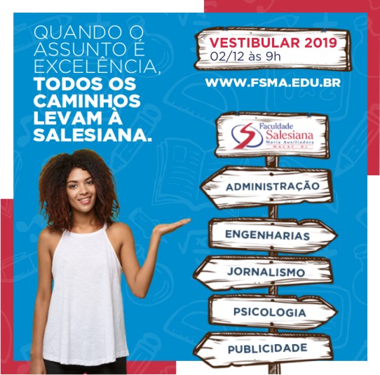 Os interessados em cursar Administração, Comunicação Social com habilitação em Publicidade & Propaganda e Jornalismo, Psicologia, Engenharia Ambiental e Sanitária, Engenharia da Computação, Engenharia Química e Engenharia de Produção já podem fazer sua inscrição para o Vestibular da Faculdade Salesiana Maria Auxiliadora – FSMA – que dará acesso aos referidos cursos de graduação no primeiro semestre de 2019.