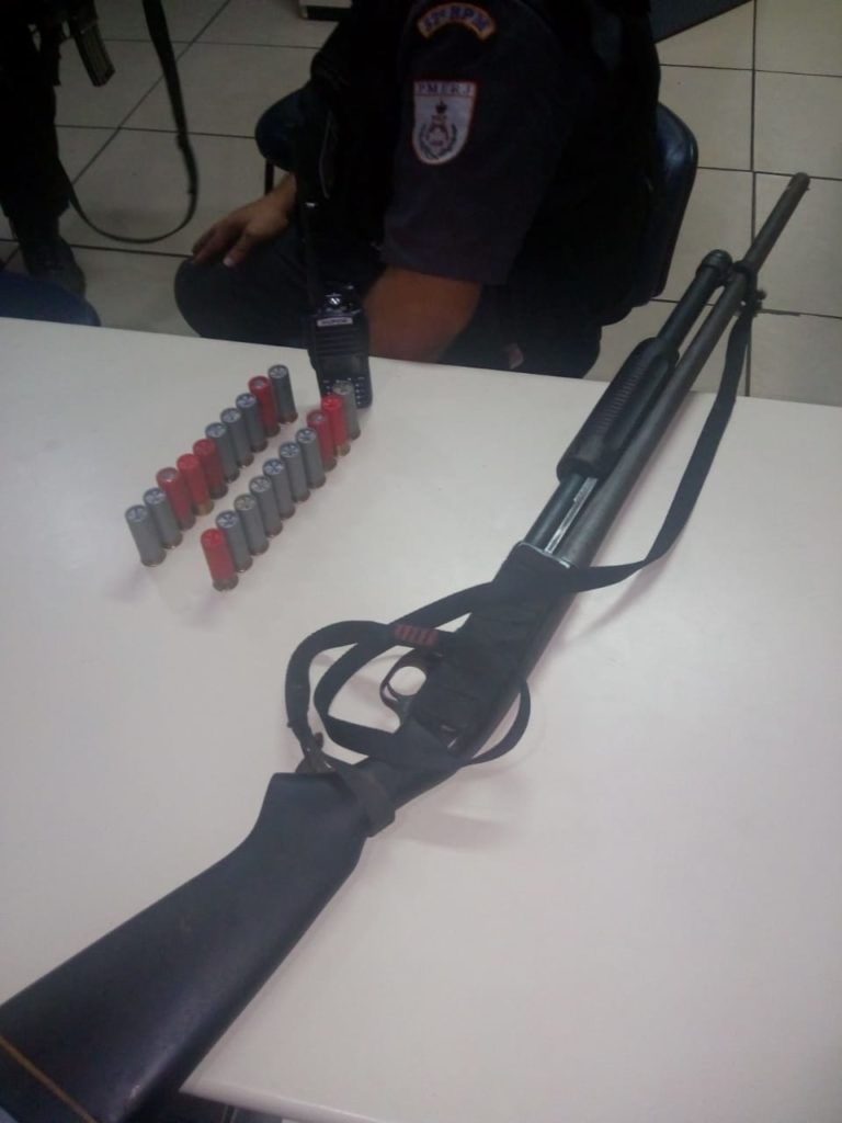 Militares efetuaram um cerco tático e conseguiram prender o acusado e apreender com ele uma espingarda calibre 12, 20 munições, um radiotransmissor digital na frequência do tráfico local e um caderno com anotações do tráfico.