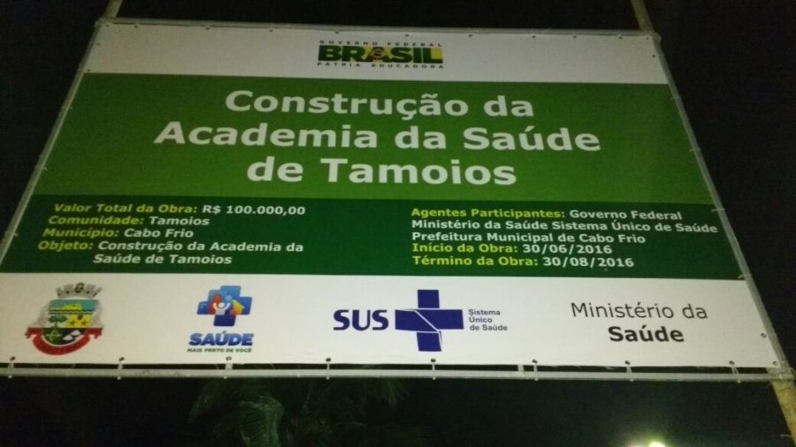 De acordo com a placa, a obra da academia de saúde termina no dia 30 de agosto e conta como agentes participantes o Governo Federal, o Ministério da Saúde, Sistema único de Saúde e a Prefeitura Municipal de Cabo Frio.