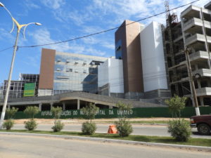 Terminada a alvenaria, a equipe está trabalhando em outras frentes, nas instalações das redes elétricas e hidráulicas, além dos dutos de ar condicionado e gases hospitalares. As fachadas externas estão 60% concluídas e os taludes, usados para sustentar as laterais, praticamente finalizados. O novo hospital terá também capacidade de instalação de um heliponto. A estrutura foi preparada para isso.