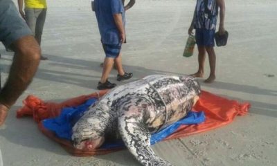 O corpo do animal foi localizado por banhistas na altura do Hotel Malibu Na manhã desta terça-feira, 12, banhistas foram surpreendidos por uma tartaruga gigante encontrada...