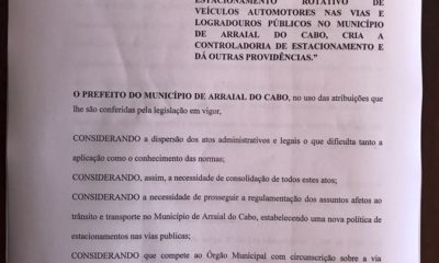 Medida foi tomada após constante reclamações de valores abusivos cobrados durante o feriado Em Arraial do Cabo um novo decreto que regulamenta o estacionamento rotativo...