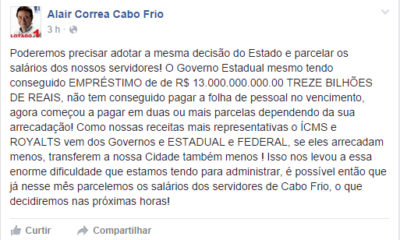 O prefeito de Cabo Frio, Alair Correa (PP), afirmou nesta quarta-feira (15) através de seu blog e de sua página nas redes sociais que pode pagar...