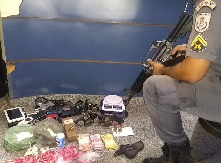 No local, foram localizados mais de 120 pinos de cocaína, tablete de maconha e duas armas calibre 38 dentro do guarda-roupa. Na casa, também foram apreendidos sete relógios de pulso, mais de vinte celulares, quatro câmeras fotográficas e munições. A esposa do traficante tentou tirar as armas da residência, mas foi presa em flagrante.