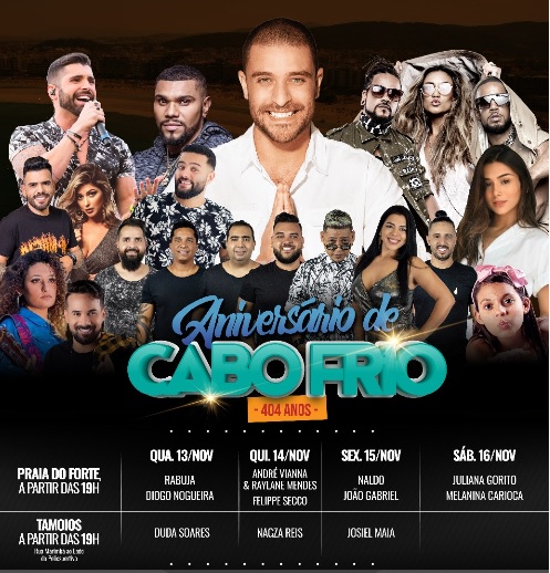 A Prefeitura de Cabo Frio divulgou a programação em celebração aos 404 anos de fundação da cidade. A festa está prevista para começar na quarta-feira, dia 13, e encerrar no sábado, dia 16 de novembro.