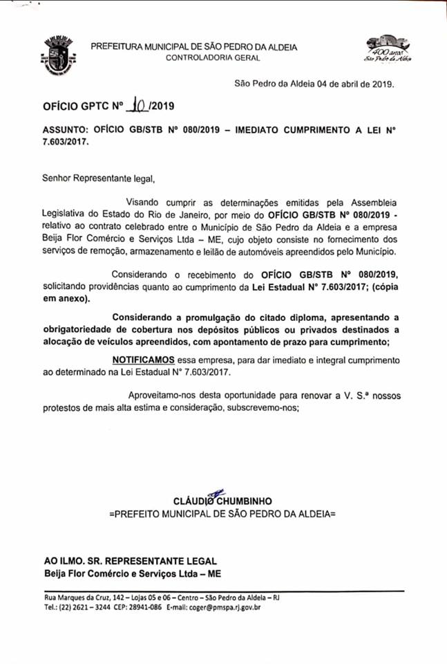 O Prefeito de São Pedro da Aldeia notificou o depósito de veículos Beija Flor. A medida atende uma solicitação do Deputado Estadual Mauro Bernardo, que desde que assumiu a cadeira no Legislativo, iniciou uma briga pelo fim do que ele chama de "máfia dos depósitos".