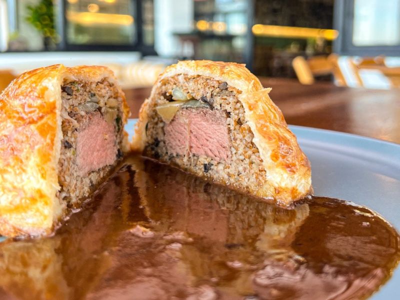 Entre as criações que serão servidas está a releitura do Bife Wellington, assinada por Eduardo Tavares, que revisita o clássico britânico com um medalhão de filé mignon selado, envolto por duxelle de tabule, finalizado com demi-glace.