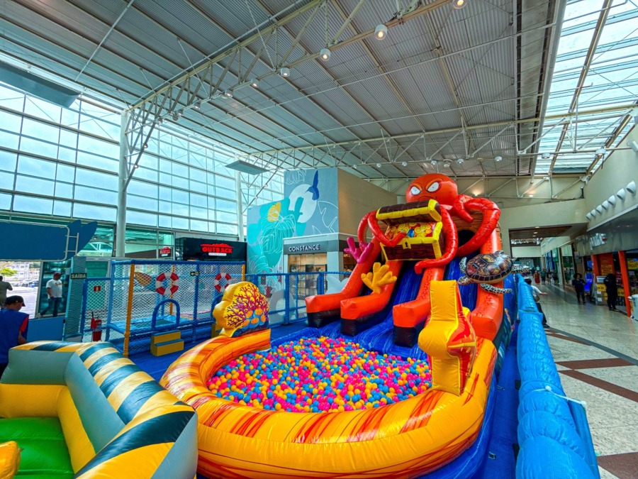 O espaço conta com atrações como tobogã em formato de polvo, piscina de bolinhas, pula-pula e circuito com obstáculos, ampliando as opções de lazer infantil durante o período de férias.