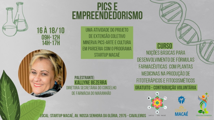 A ação é uma atividade do projeto de extensão Coletivo Minerva PICS-Arte e Cultura e da LAPICS (Liga Acadêmica de Práticas Integrativas e Complementares em Saúde) em parceria com a UFRJ Campus Macaé e vai contar com a palestrante Kallyne Bezerra, Diretora do Conselho de Farmácia do Maranhão.