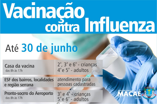 Termina no dia 30 de junho, a Campanha Nacional de Vacinação contra a Gripe (Influenza). Em Macaé, os locais e horários para que o público-alvo receba a dose, estão no site da prefeitura (www.macae.rj.gov.br).