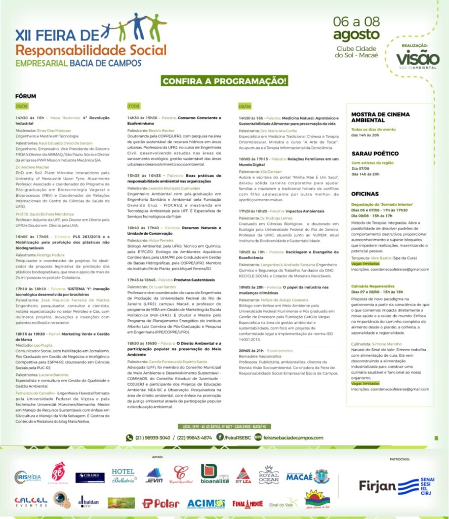 Com o tema 4ª Revolução Industrial, Marketing Verde e Impactos Ambientais, começa nesta terça-feira (06) em Macaé, a XII Feira de Responsabiçidade Social. O evento segue até a próxima quinta-feira, dia 08 de agosto, e será realizado no Clube Cidade do Sol.