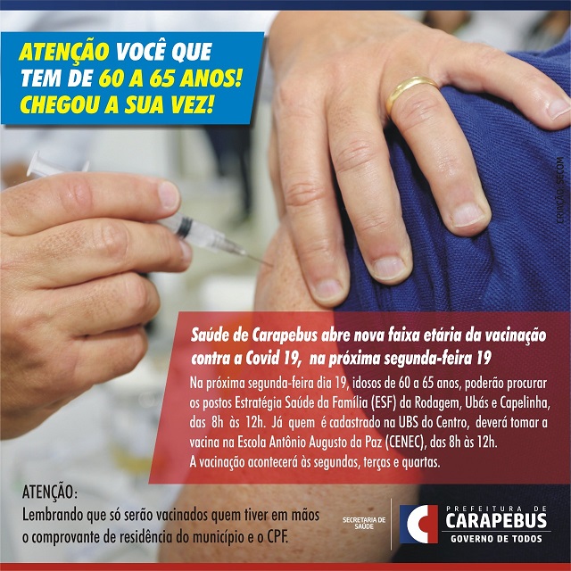 Na próxima segunda-feira (19), Carapebus inicia a vacinação contra a Covid-19 aos idosos de 60 a 65 anos. Segundo a Secretaria de Saúde, os idosos nesta faixa etária deverão procurar, das 08h às 12h, os postos de Estratégia de Saúde da Família (ESF) da Rodagem, Ubas e Capelinha. Já quem é cadastrado na UBS do Centro, deverá tomar a vacina na Escola Antônio Augusto da Paz (CENEC), também das 08h às 12h. Só serão vacinados quem apresentar o comprovante de residência e o CPF.