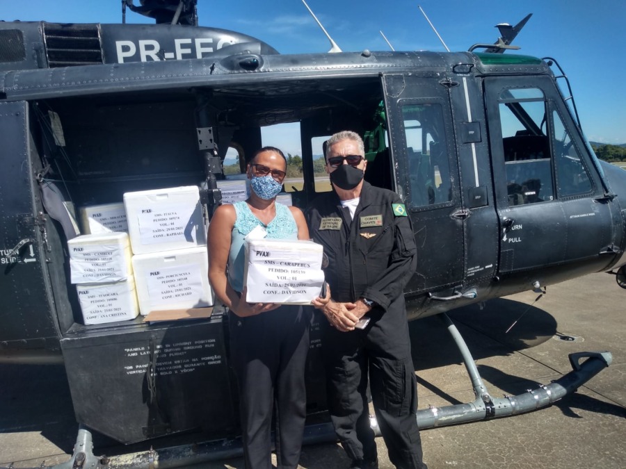 A Secretaria Estadual de Saúde encaminhou nesta segunda-feira (25) mais doses da vacina Astrazeneca/Oxford, fabricada na Índia, para os 92 municípios do estado. Para o interior, como Carapebus, foram enviadas 170 doses da vacina. As vacinas foram entregues no Aeroporto de Macaé e chegaram em um helicóptero da Polícia Civil, com a presença também do secretário estadual de Saúde. Carlos Alberto Chaves, e da Auxiliar de Enfermagem de Carapebus, Isabel Cristina Souza Leite.