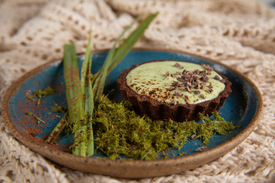 Filé de tambaqui marinado na cachaça, temperado com pimenta-de-macaco e flor de sal, recheado com ora-pro-nóbis, envolto em folha de bananeira e cozido no vapor, finalizado com pimenta biquinho e flor de sal. Acompanha arroz com urucum, pimenta rosa e chips de batata doce.