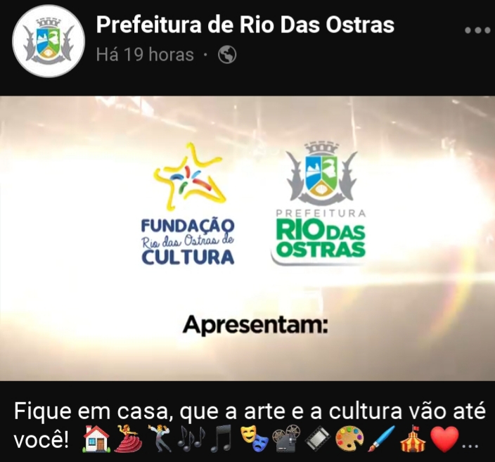 Pela rede social, a Secretaria Municipal de Rio das Ostras (https://www.facebook.com/watch/?v=549414429034334), mobilizou músicos, atores, cantores e produtores culturais, para que acompanhem, por meio de lives, apresentações em casa. Numa campanha, os artistas reforçam o apelo: Fiquem em Casa, mas se divirtam com atividades culturais. Os artistas estarão fazendo lives através das suas redes sociais.