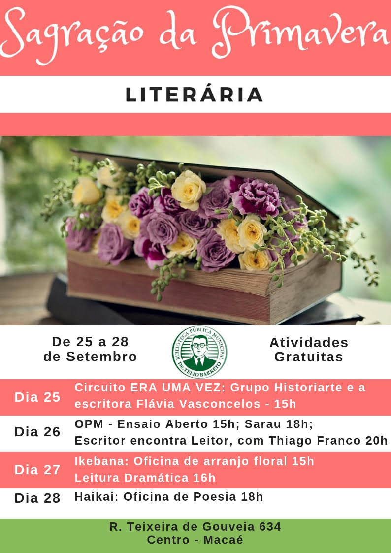 A primavera chegou e a Secretaria de Cultura de Macaé vai celebrar a estação com o evento “Sagração da Primavera Literária”. Oficinas de haikai, de Ikebana e lançamentos de livros vão marcar programação. As ações culturais vão acontecer de terça-feira (25) a sexta-feira (28) na Biblioteca Municipal Dr. Télio Barreto, que funciona em novo endereço, na Rua Teixeira de Gouveia, 641, no Centro (antiga Igreja Batista). Atualmente, a biblioteca conta com acervo de cerca de 30 mil títulos à disposição da população. O objetivo da prefeitura é dinamizar as bibliotecas municipais, assim como o museu da cidade, para a universalização destes espaços públicos culturais.