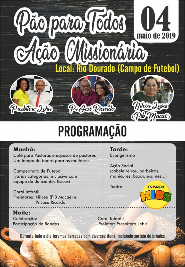 Realizado pela primeira vez na comunidade, o evento “Pão para Todos”, segundo a pastora Ana Lúcia Valdomiro, vai levar aos moradores serviços como terapia familiar, cabeleireiro, barbeiros, manicure , bazar, exames, além de espaço kids e teatro. À noite, celebração com participação de bandas e coral infantil.