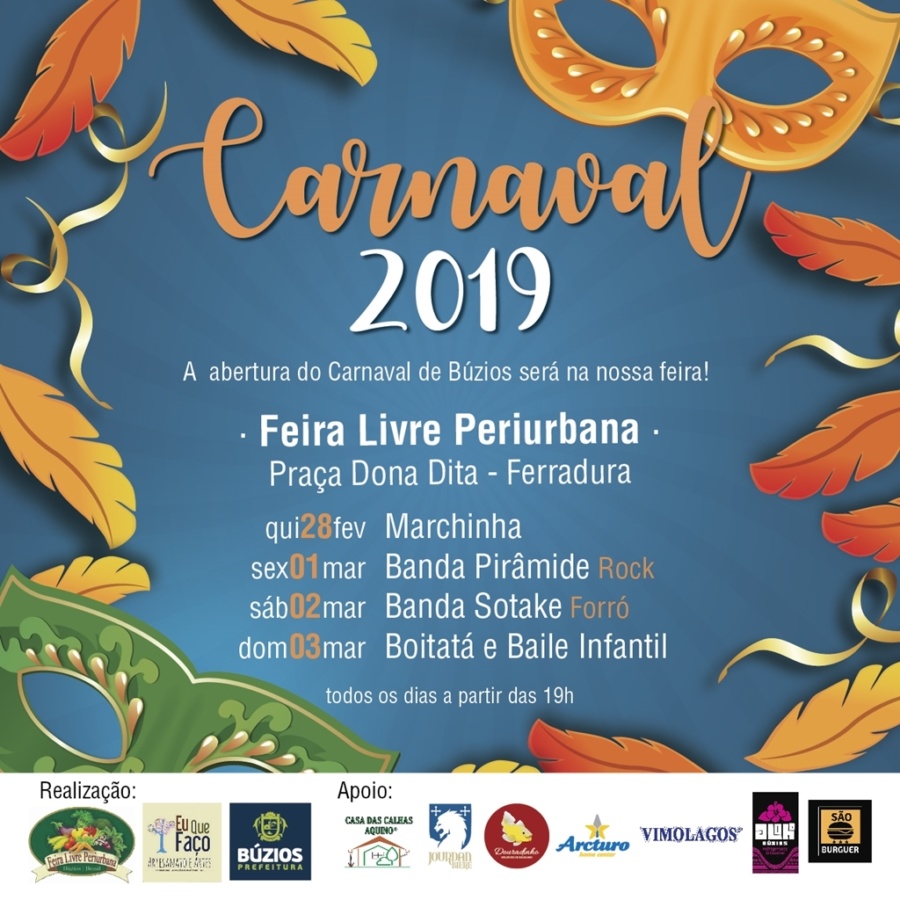 O Carnaval da Feira Periurbana, em Búzios, será iniciado nesta quinta-feira (08). O evento será na Praça Dona Dita, na Ferradura. Até o domingo de carnaval, dia 03, haverá programação para cair na folia com bandas, bloco e baile infantil, sempre a partir das 19h.