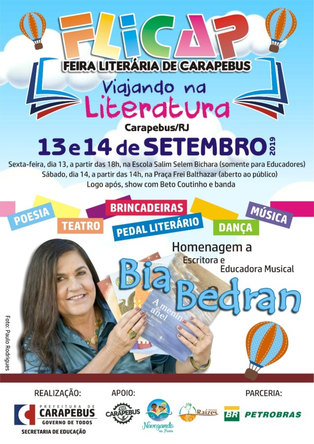 A Praça Frei Balthazar, em Carapebus, sedia nesta sexta-feira (13) e sábado (14), a FLICAP (Feira Literária), com a presença da escritora e educadora musical, Bia Bedran. O evento vai reunir escritores, intelectuais e o público em geral, que vão 'viajar' no mundo da literatura, com poesias, teatro, brincadeiras, danças, músicas, oficinas e um pedal literário, reunindo esporte e cultura em um só evento.
