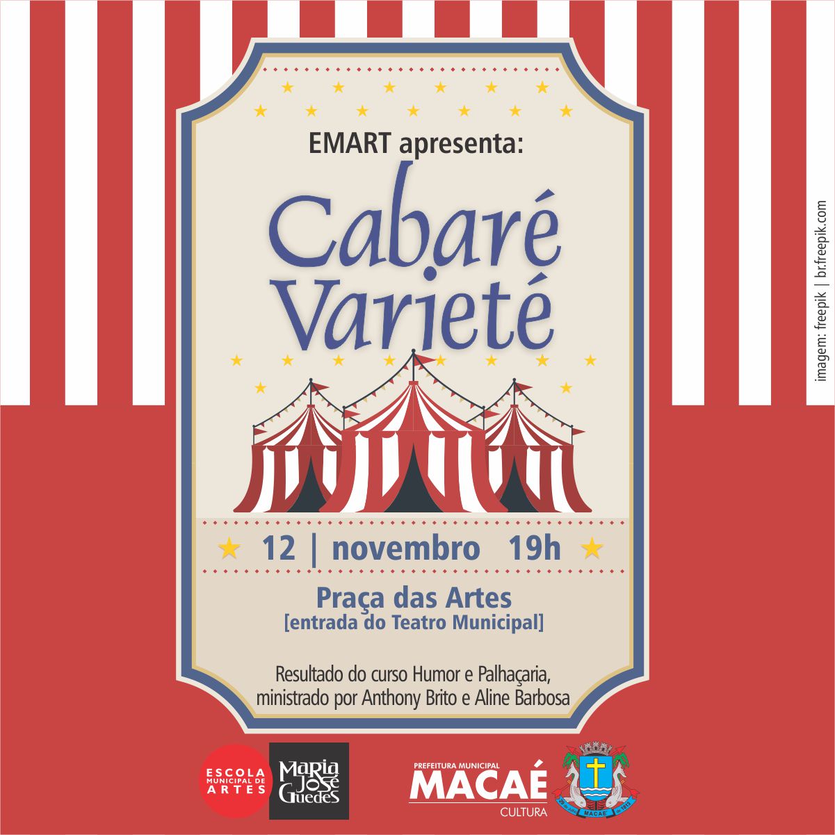 A Escola Municipal de Artes Maria José Guedes (Emart) realiza nesta terça-feira (12), a partir das 19h00, a primeira série de apresentações com o espetáculo de palhaçaria "Cabaré Varieté". O evento será na Praça das Artes, no Centro Macaé de Cultura, com show de palhaços. A apresentação será aberta ao público.