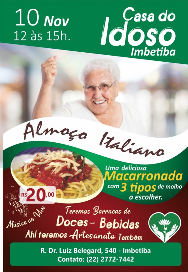 A Casa do Idoso, localizada no bairro Imbetiba, em Macaé, promove neste domingo (10), das 12h às 15h, almoço italiano. Os convites estão sendo vendidos a R$ 20 na recepção da entidade.