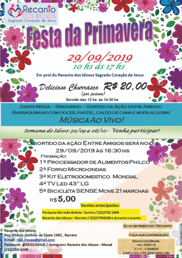 No próximo domingo (29), o Recanto dos Idosos Sagrado Corações de Jesus realiza a Festa da Primavera, em prol da instituição. No dia será servido um delicioso almoço (churrasco) a R$ 20 por pessoa, das 12h às 14h30.