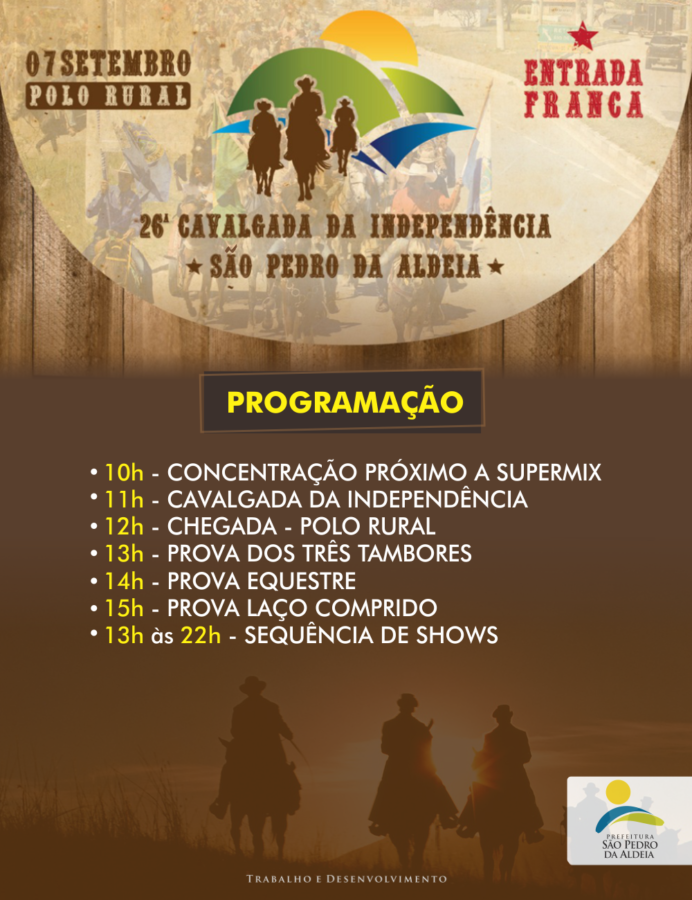 O feriado da Independência do Brasil, na próxima sexta-feira, 7 de setembro, será agitado no Polo Rural de São Pedro da Aldeia. A programação festiva contará com shows e provas equestres, de laço e três tambores, a partir das 13h. A abertura dos festejos será marcada pela 26ª Cavalgada da Independência, com saída prevista para as 11h da Rodovia RJ-140, na altura do bairro Campo Redondo. A iniciativa é uma realização da Prefeitura aldeense em parceria com o Clube dos Cavaleiros e Amazonas de São Pedro da Aldeia. A entrada é gratuita. O Polo Rural fica situado na Estrada da Cruz, na zona rural do município.