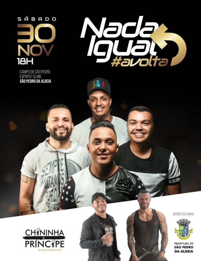 O show do grupo Nada Igual, em São Pedro da Aldeia, já tem nova data marcada: 30 de novembro. A apresentação, que marcará o retorno do grupo aos palcos, será no campo do São Pedro Esporte Clube, a partir das 18h. A dupla Chininha & Príncipe também vai se apresentar na festa, com show completo. A entrada será um quilo de alimento não perecível. Os interessados devem garantir sua pulseira/ingresso de forma antecipada em um dos pontos de troca. A programação conta com o apoio cultural da Prefeitura aldeense, por meio da Secretaria Adjunta de Esportes e Lazer. As pulseiras trocadas para o dia 15 de novembro são válidas para o show do dia 30.