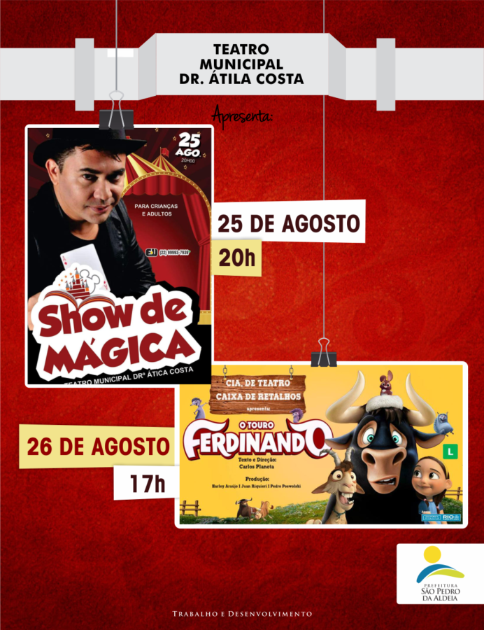 Em São Pedro da Aldeia, o Teatro Municipal apresentará, neste fim de semana, show de mágica e peça infantil. Será uma programação especial para o público de todas as idades. No sábado (25), às 20h, o palco aldeense recebe o espetáculo “Show de Mágica”. Os ingressos estão à venda na bilheteria do teatro, no comércio local e online por R$ 20, antecipados.